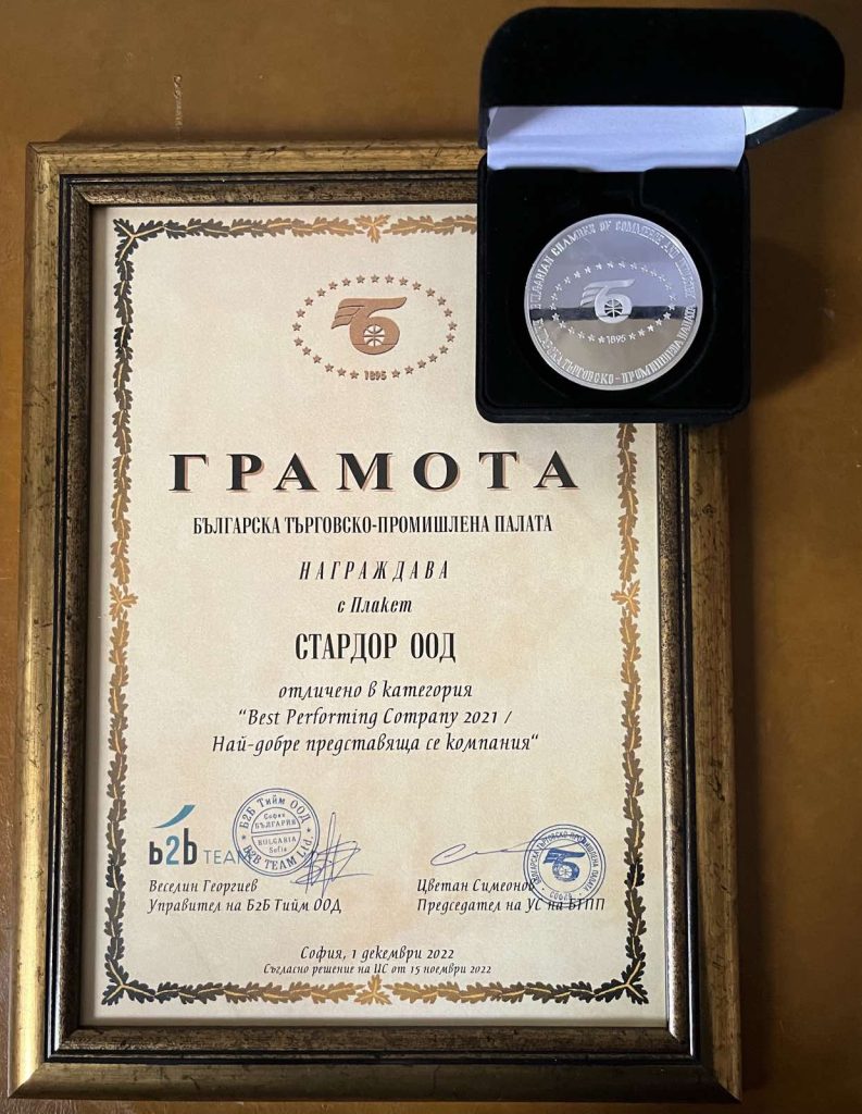 „Стардор ООД“ получи плакет и грамота в категорията „Най-добре представяща се компания през 2021 г.“